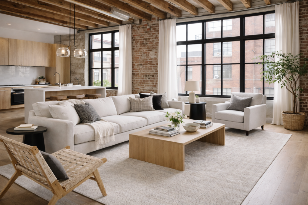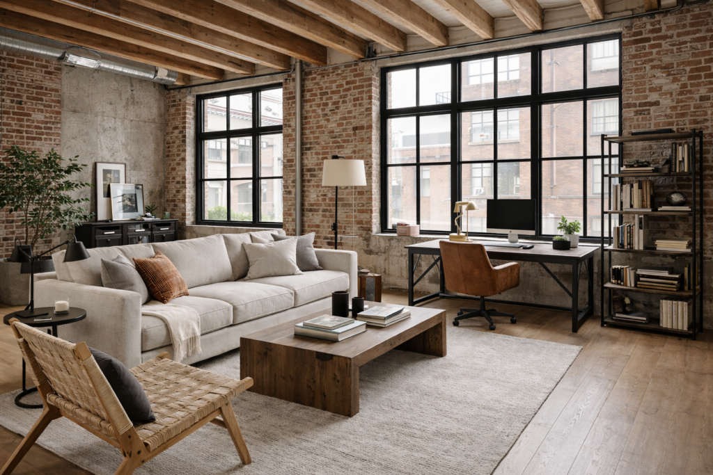 Typisch sind robuste Materialien wie Beton, Stahl, Eisen, Glas und naturbelassenes oder recyceltes Holz. Oberflächen dürfen Patina zeigen und verleihen dem Raum Tiefe und Charakter. Die Farbwelt ist meist zurückhaltend und kühl, geprägt von Grau-, Schwarz- und Erdtönen, ergänzt durch metallische Akzente. Möbel sind klar, stabil und funktional – oft mit Anleihen aus Werkstatt- oder Fabrikdesigns.
