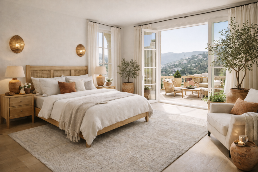 Typisch sind warme, erdige Farbwelten wie Sand-, Beige- und Terrakottatöne, ergänzt durch Akzente in Weiß, Ocker, Olivgrün oder sanftem Blau. Natürliche Materialien wie Naturstein, Keramik, Terrakotta, Holz oder Leinen prägen das Erscheinungsbild und verleihen dem Raum Authentizität und Beständigkeit. Möbel sind häufig schlicht, handwerklich geprägt und auf Komfort ausgelegt.